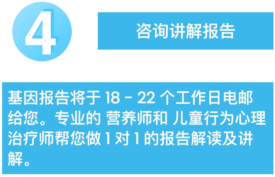 基因报告将于 18 - 22 个工作日电邮给您。专业的 营养师和 儿童行为心理治疗师帮您做 1 对 1 的报告解读及讲解。